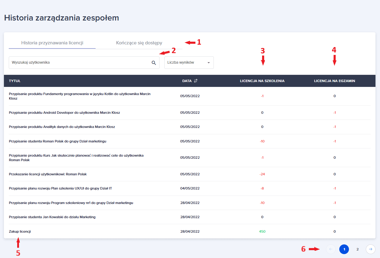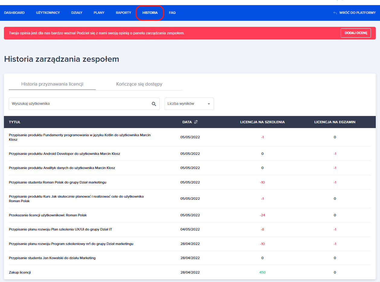 Ad. 3 - Kolumna z licencjami na szkolenia, pokazuje bilans dodanych i odjętych licencji