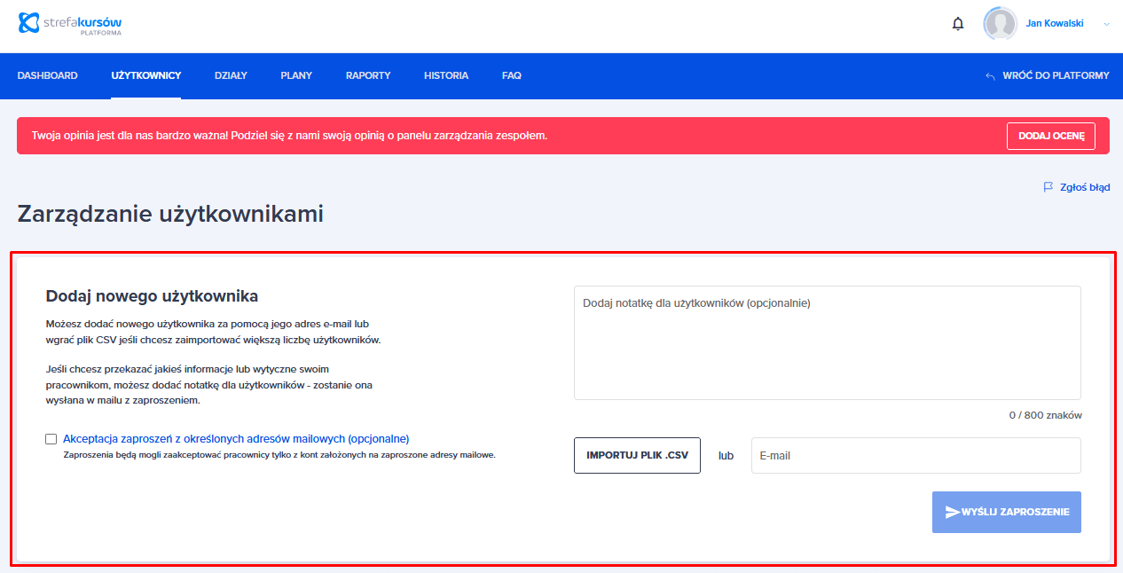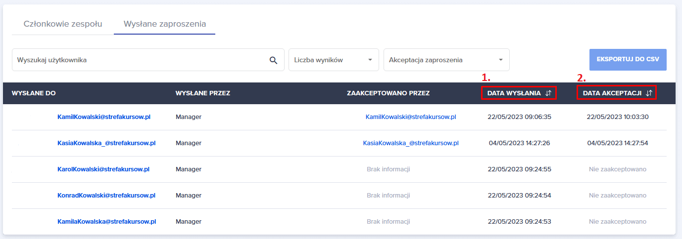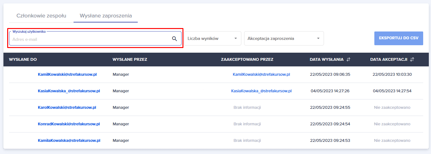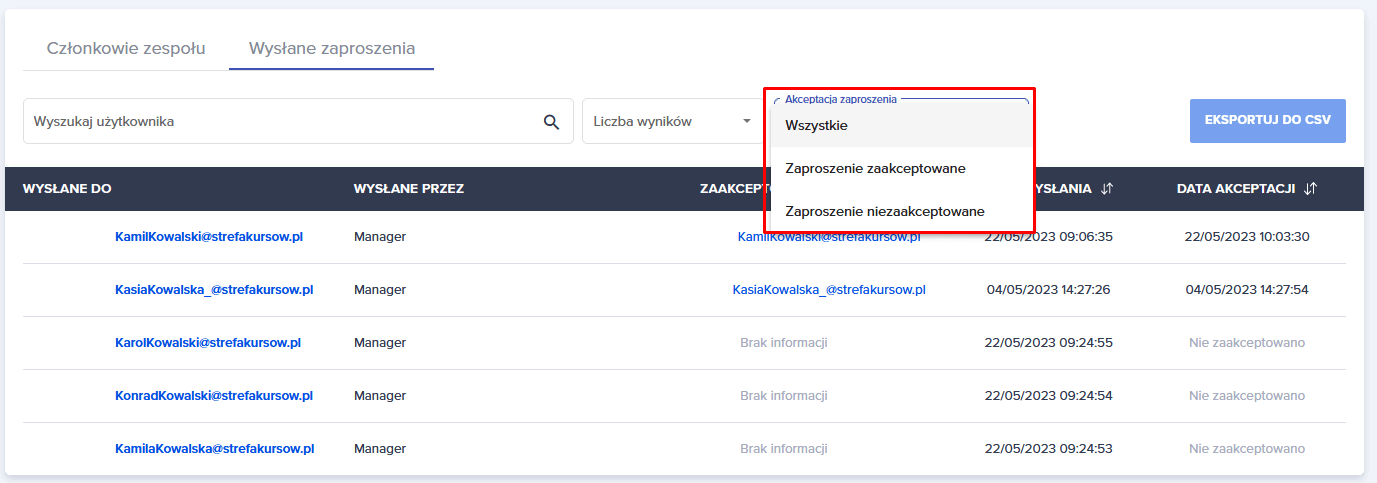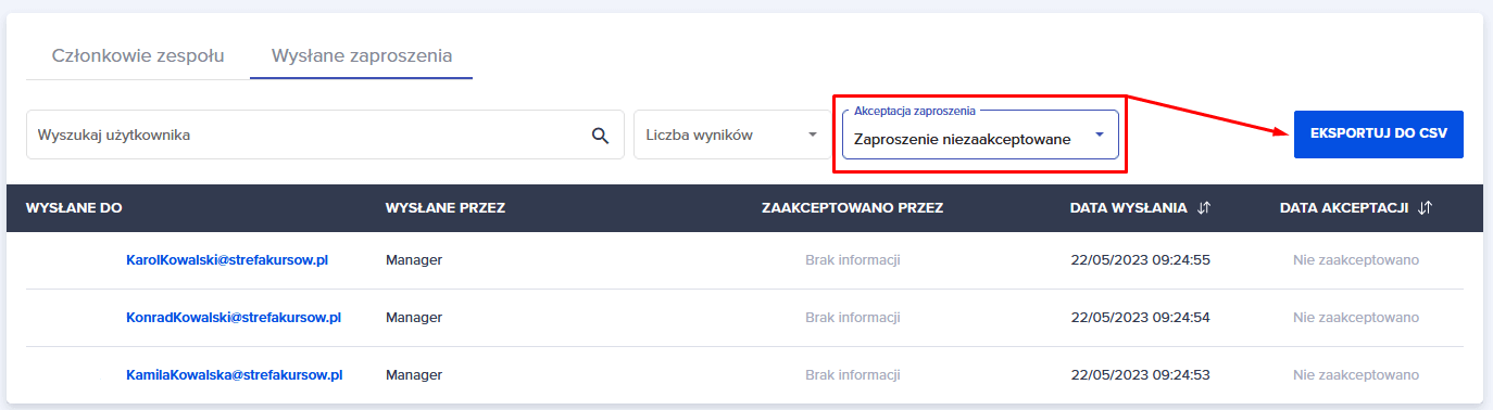 Manager ma możliwość pobrania pliku csv z zaproszeniami niezaakceptowanymi.
