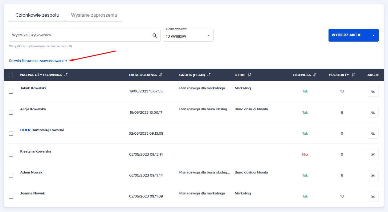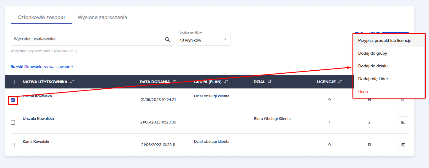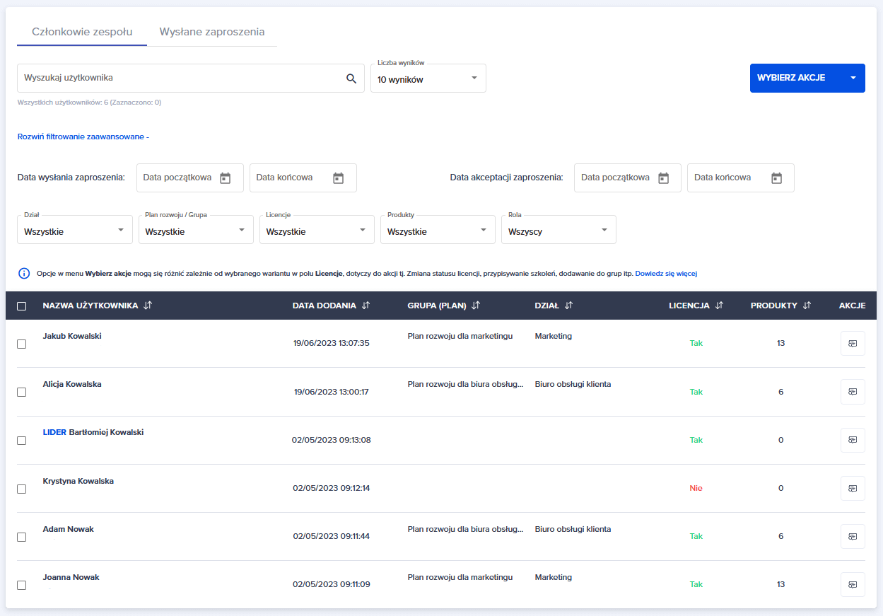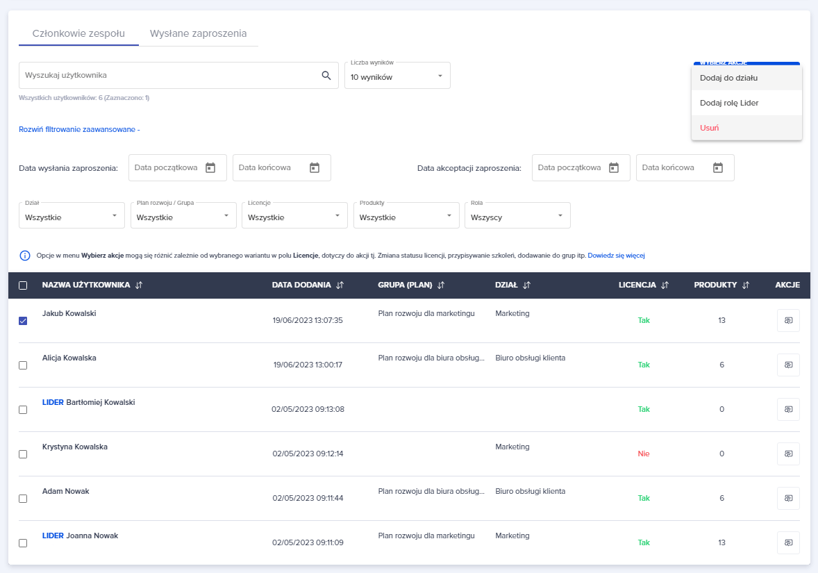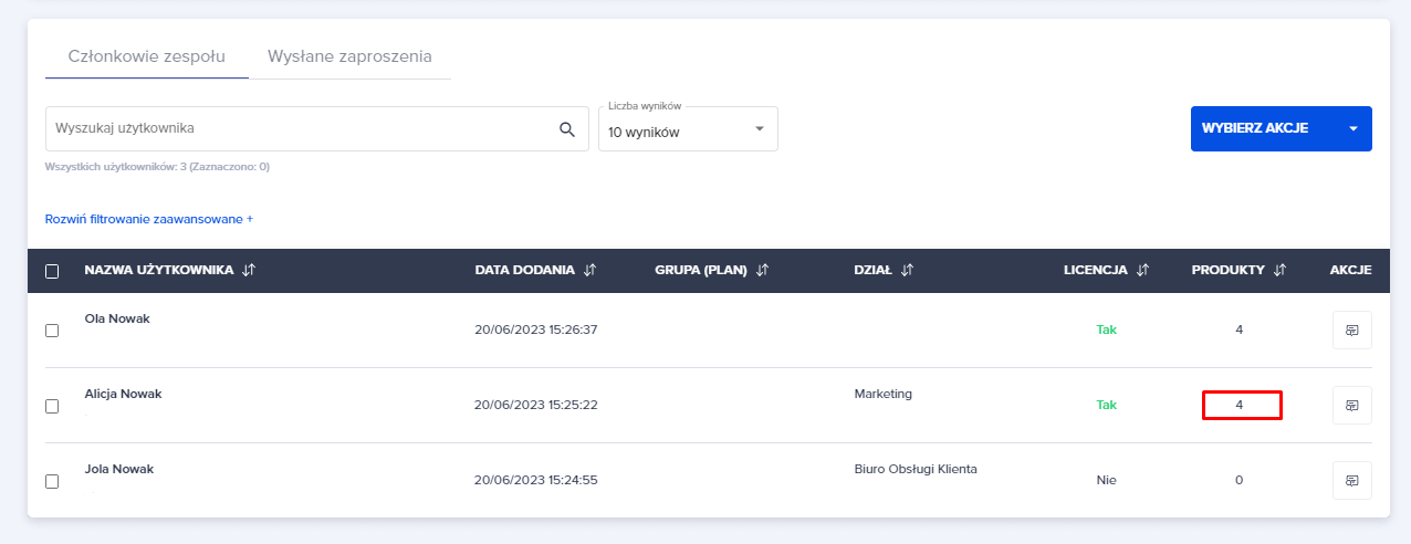 Możesz również skorzystać z opcji niebieskiego przycisku “WYBIERZ AKCJE”. Pod tym przyciskiem kryją się opcje, które można zastosować do zaznaczonych użytkowników.