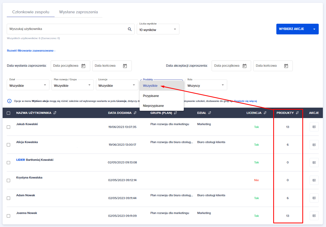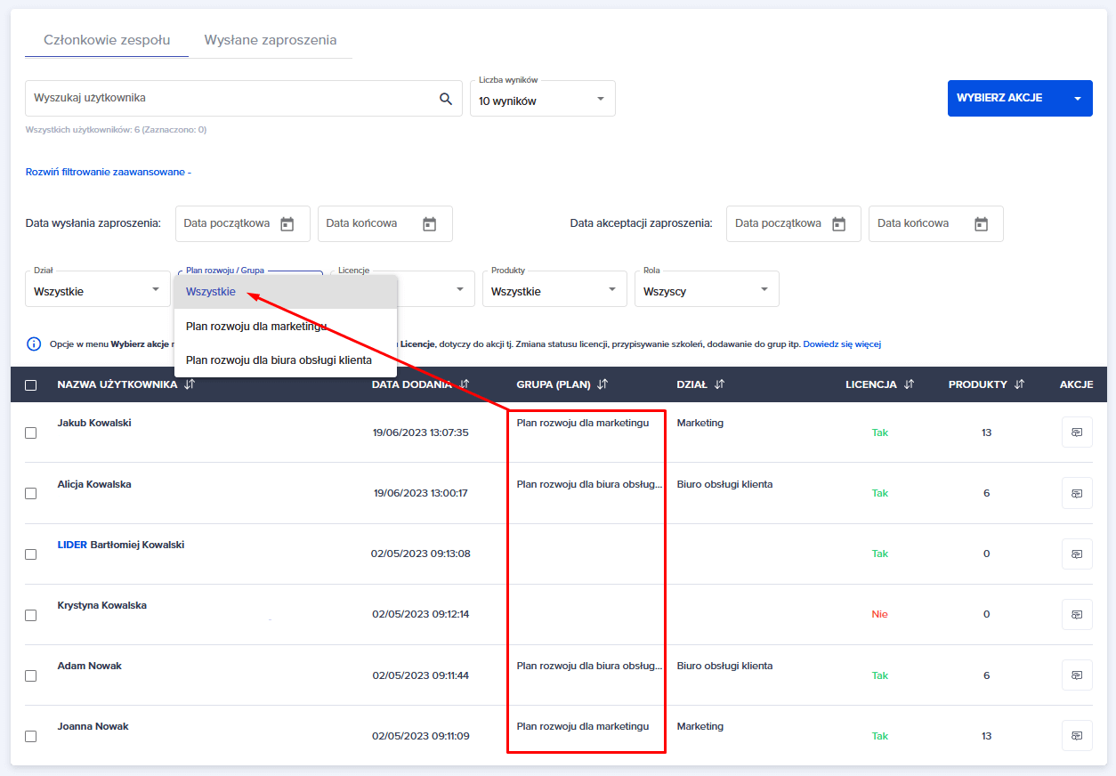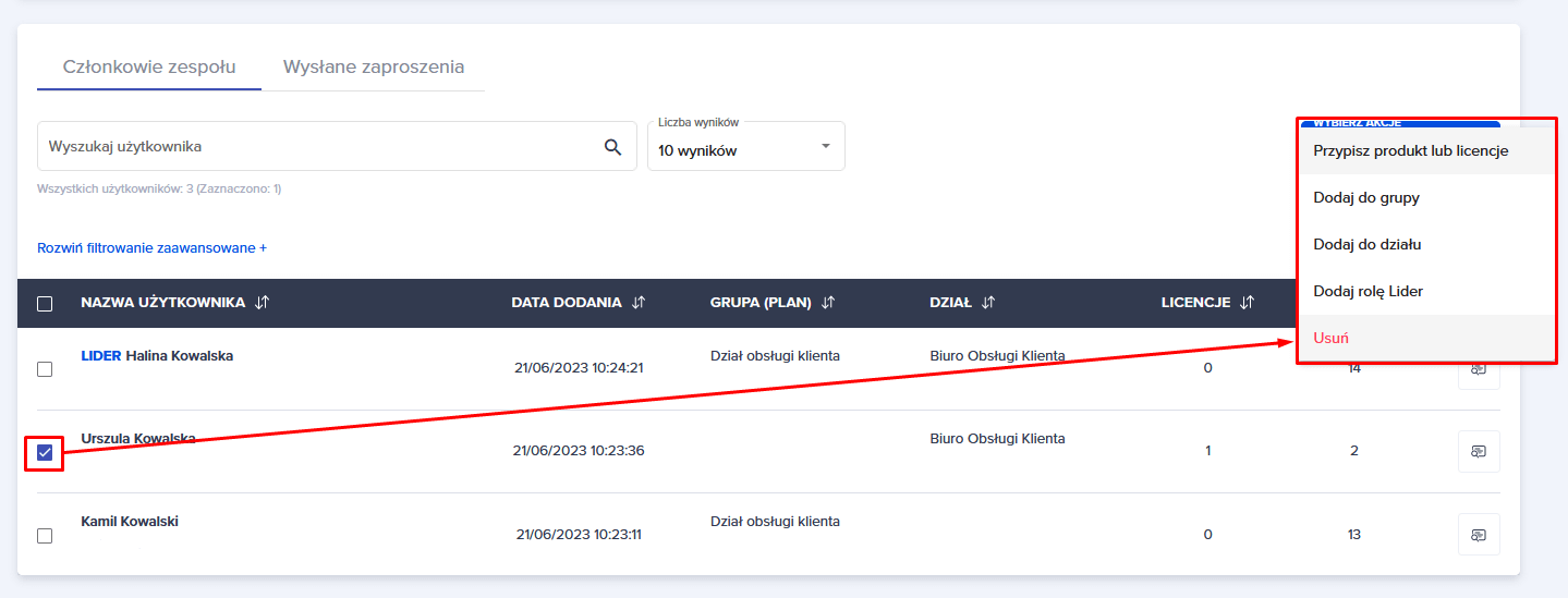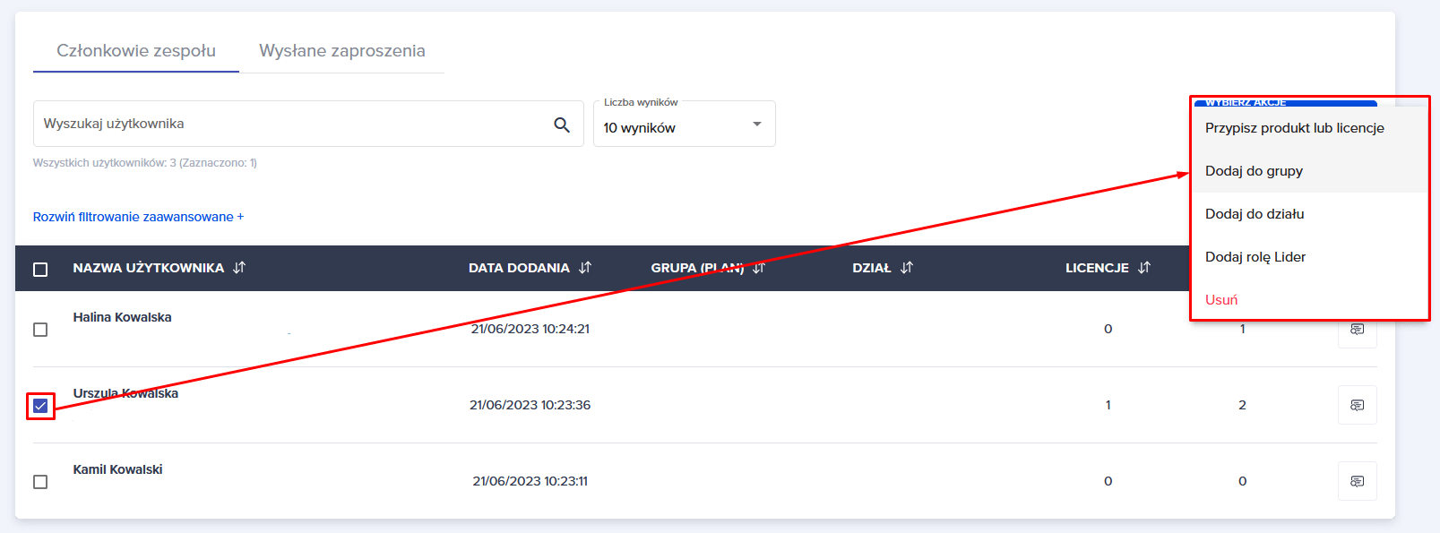 Możesz również skorzystać z opcji niebieskiego przycisku “WYBIERZ AKCJE”. Pod tym przyciskiem kryją się opcje, które można zastosować do zaznaczonych użytkowników.