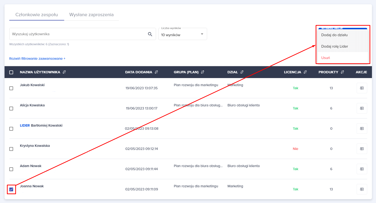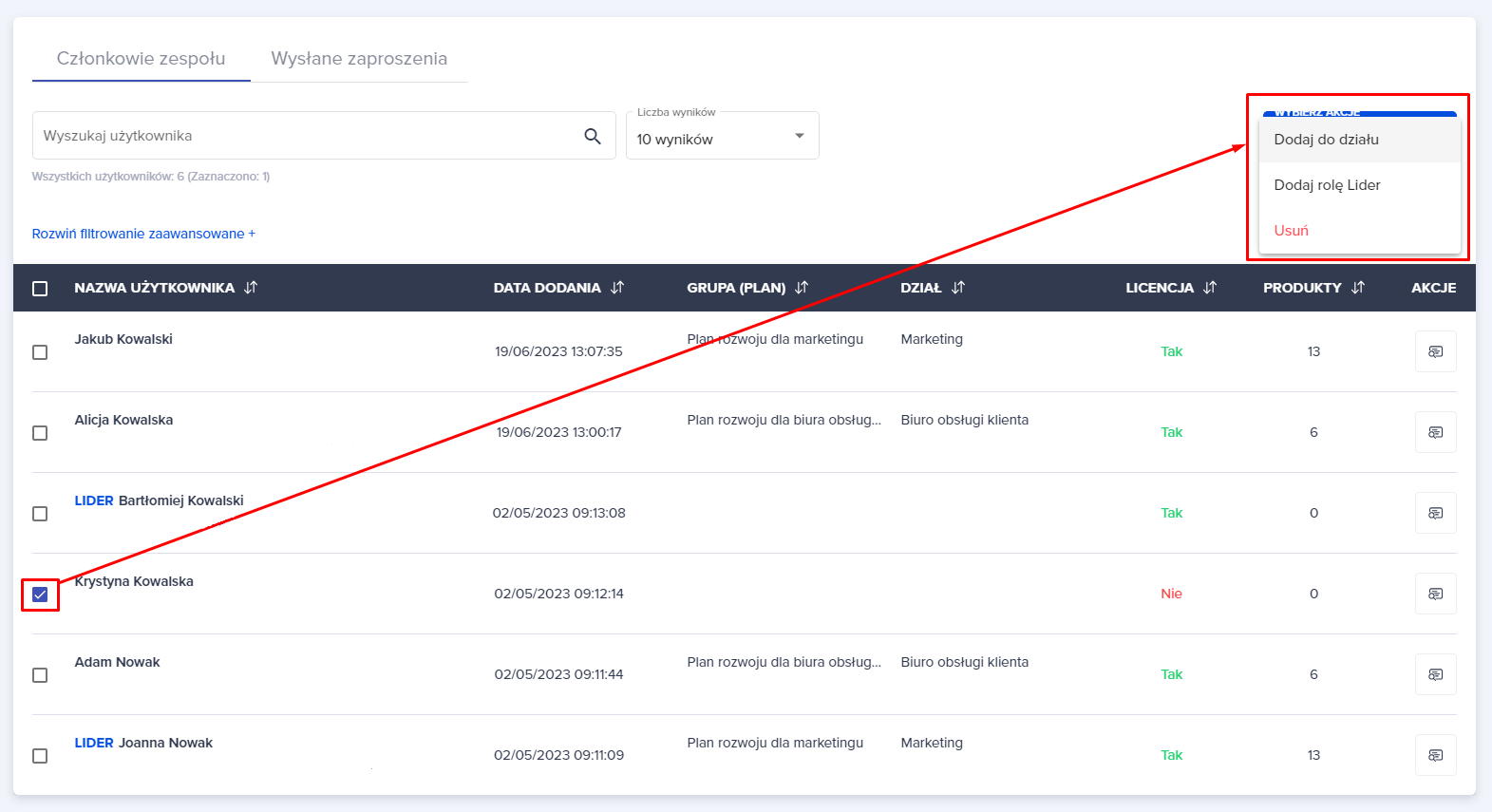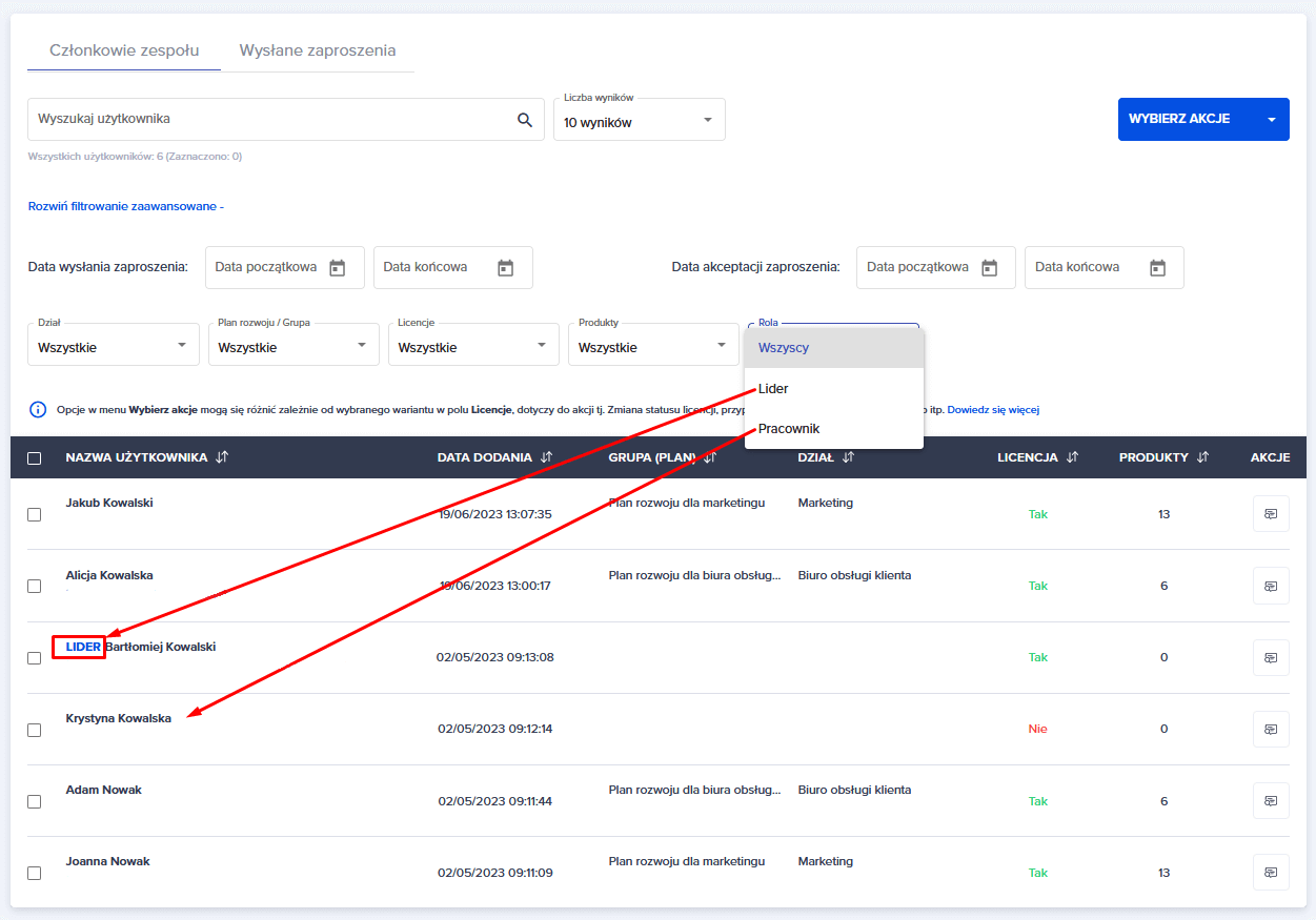 1. Zaznaczamy checkbox przy danym pracowniku, któremu chcemy nadać rolę lidera. Następnie rozwijamy niebieski przycisk “WYBIERZ AKCJĘ” i wybieramy opcję “Dodaj rolę Lider”.