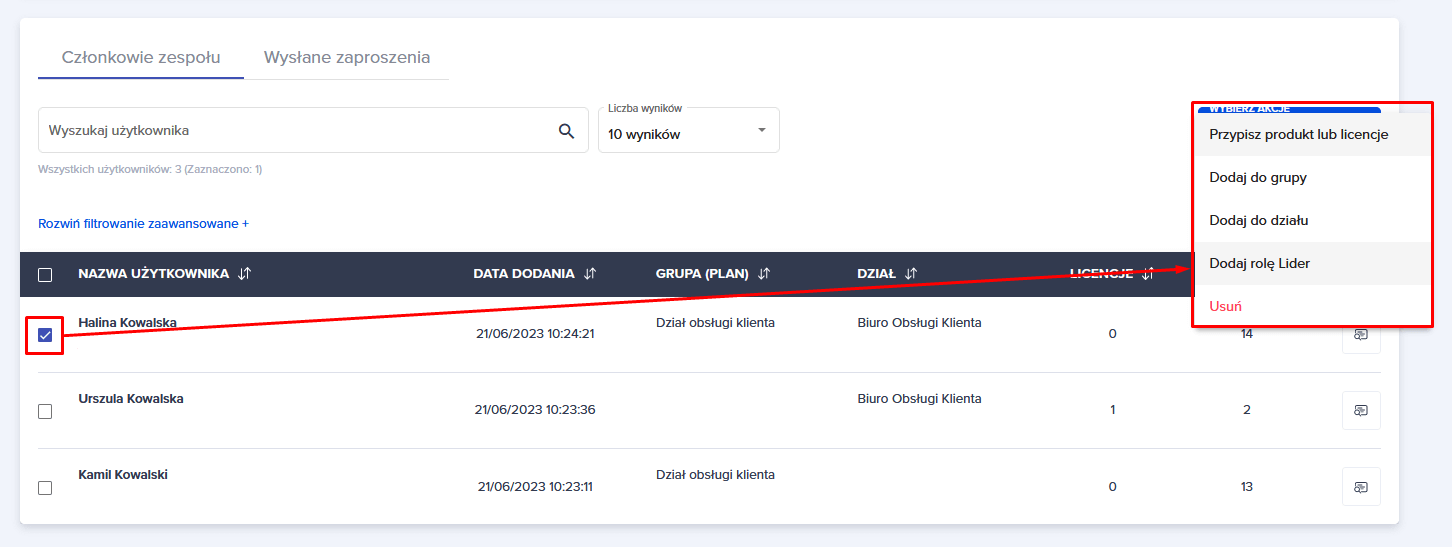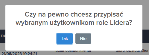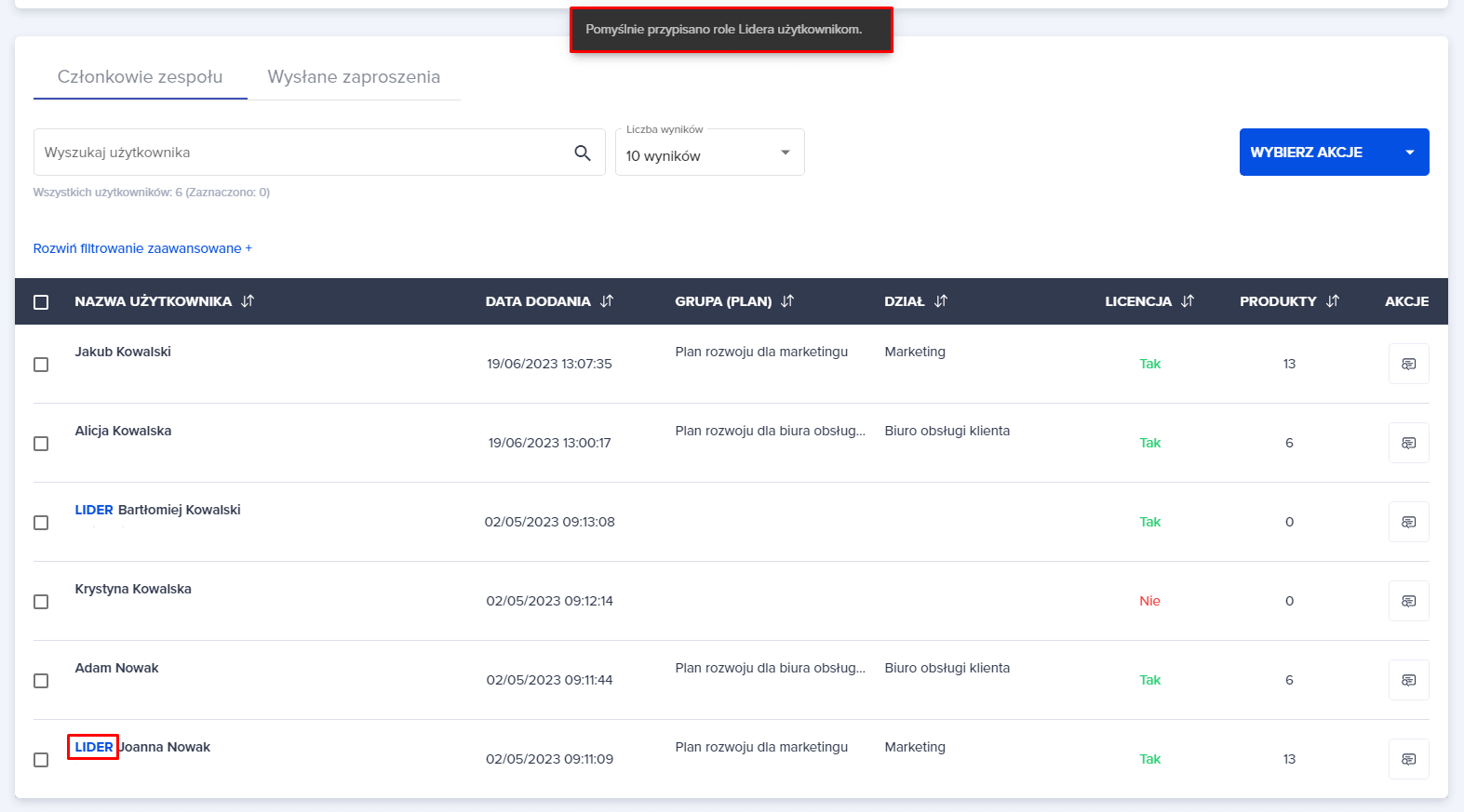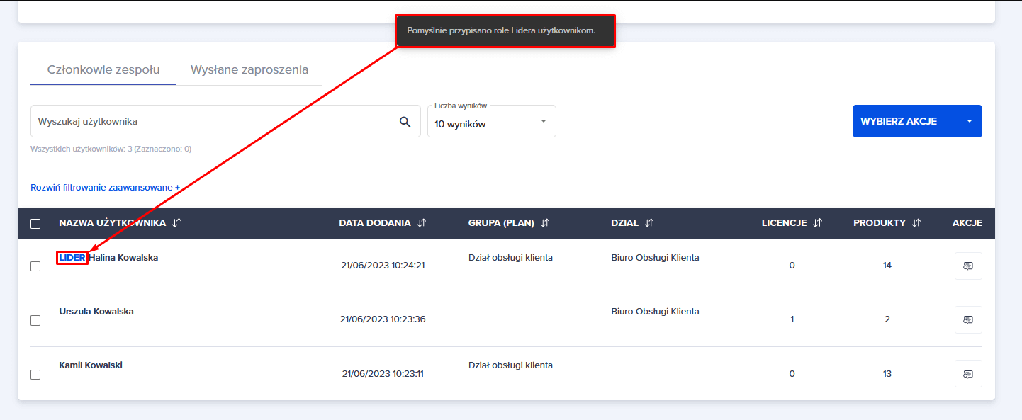 2. Pojawi Ci się komunikat “Pomyślnie przypisano role Lidera użytkownikom”. Przy imieniu i nazwisku widoczne jest teraz oznaczenie “Lider” .