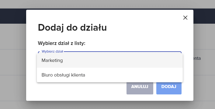 2. Pojawia się okno “Dodaj do działu”. Rozwijamy opcję “Wybierz dział” → tutaj wyświetlą się stworzone przez Ciebie wcześniej działy. Wybierz spośród nich dział, do którego chcesz przypisać swojego pracownika. Po wybraniu kliknij “Dodaj”.