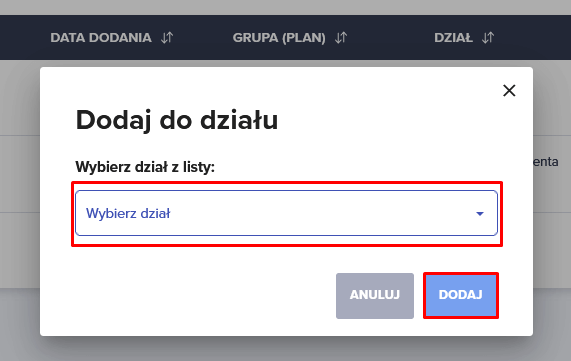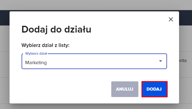 3. Po wybraniu działu, zatwierdzamy przyciskiem “Dodaj”.