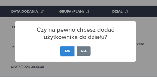 5. Następnie pojawia się poniższy komunikat, potwierdzający dodanie użytkownika/użytkowników do działu. W tabeli w kolumnie “DZIAŁ” pojawia się nazwa działu, który przed chwilą przypisaliśmy użytkownikowi.