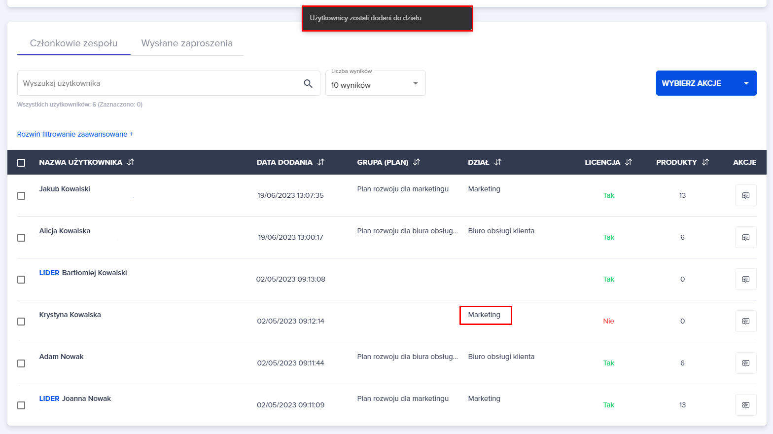 4. Pojawia się komunikat o pomyślnym dodaniu użytkownika do działu. Przy użytkowniku, którego przypisaliśmy do działu, w kolumnie “DZIAŁ”, widnieje nazwa tego właśnie działu.