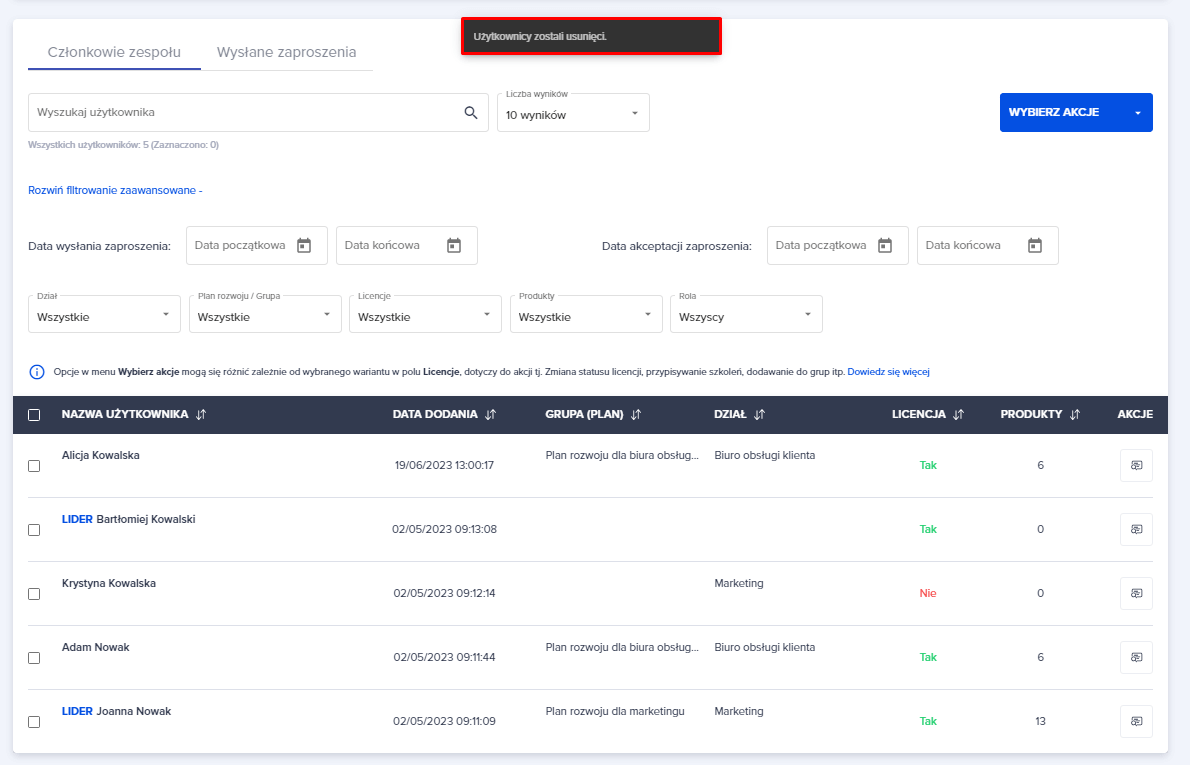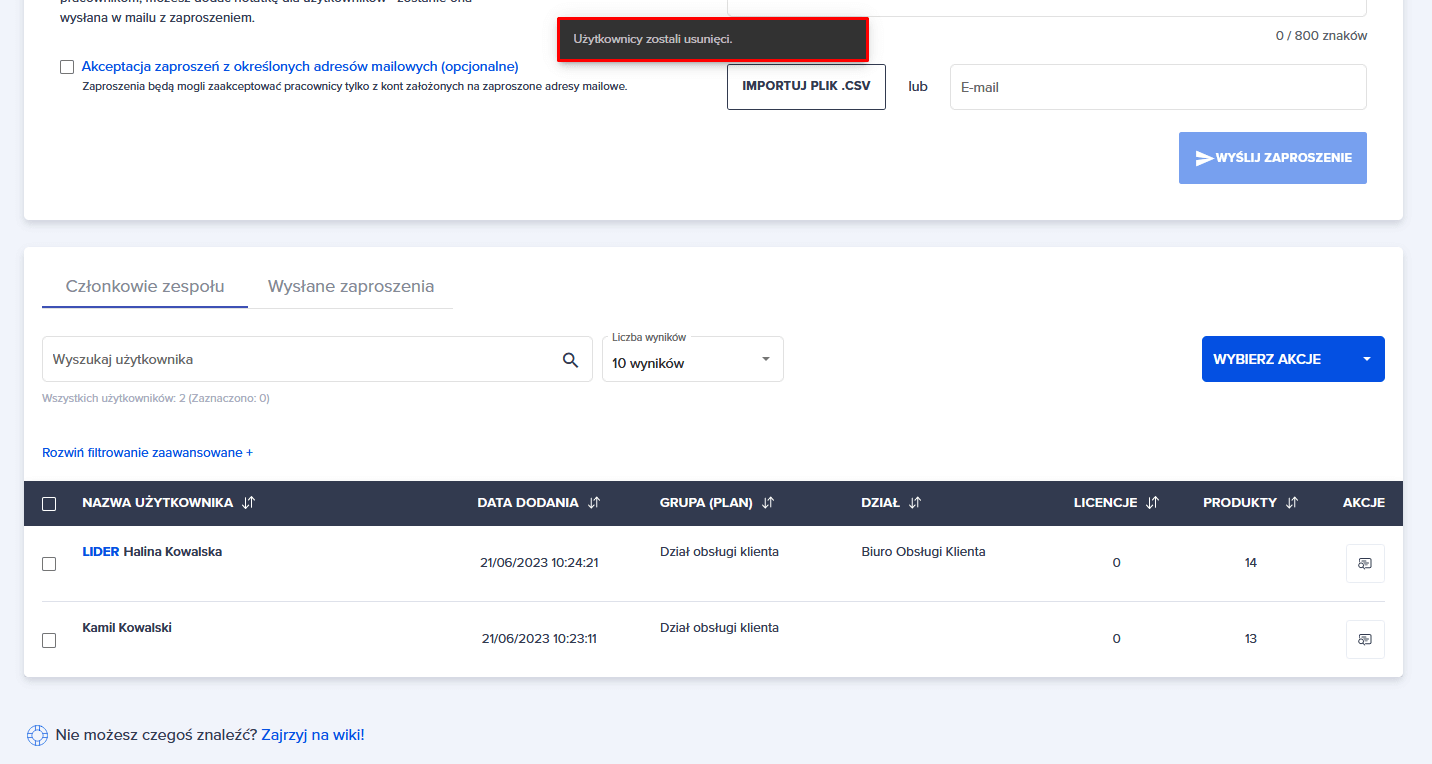 3. Poniżej pojawia się komunikat o usunięciu pracownika z zespołu. Nie jest on już dostępny w tabeli w zakładce “Członkowie zespołu”.