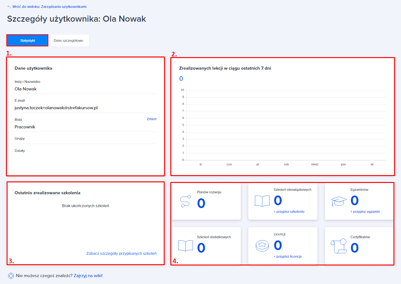 Ta podstrona - "Szczegóły użytkownika:" jest podzielona na dwie zakładki: “Statystyki” oraz “Dane szczegółowe”.