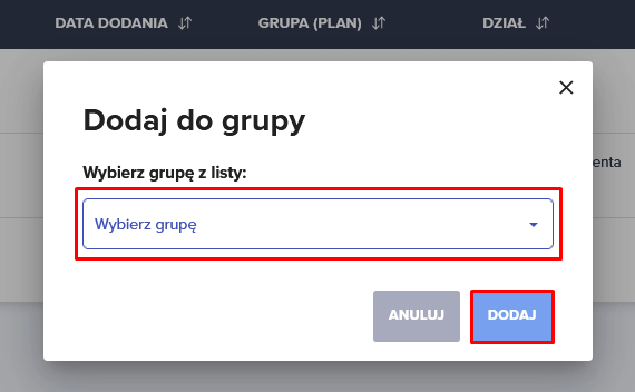 2. Pojawia się okno “Dodaj do grupy”. Rozwijamy opcję “Wybierz grupę” → tutaj wyświetlą się stworzone przez Ciebie wcześniej grupy. Wybierz spośród nich grupę, do której chcesz przypisać swojego pracownika. Po wybraniu kliknij “Dodaj”