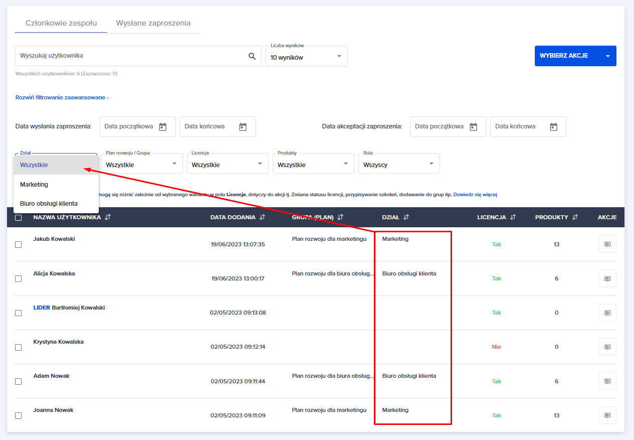 Następnie rozwijamy opcję niebieskiego przycisku “WYBIERZ AKCJĘ” i spośród dostępnych opcji klikamy “Dodaj do działu”.