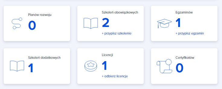 4. W tej sekcji możesz zobaczyć czy twój pracownik ma przypisane plany rozwoju, szkolenia, licencje, egzaminy i czy posiada jakieś certyfikaty. W kafelkach znajdują się niebieskie przyciski “+ przypisz …”, za pomocą których możesz przypisać: