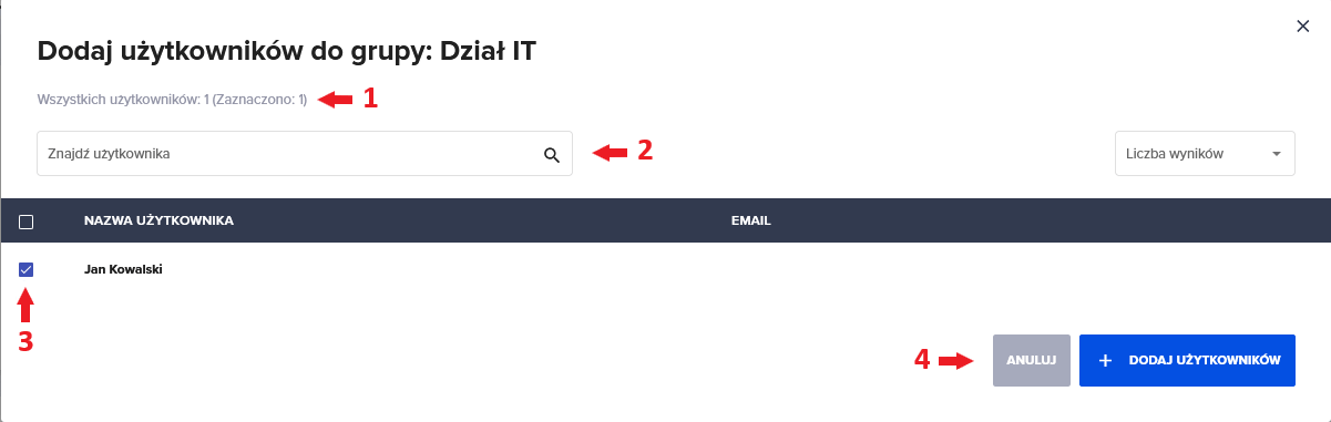 Ad. 4 - Przyciski “Anuluj” i “Dodaj użytkownika” odpowiadają za kolejno odrzucenie akcji, i dodanie zaznaczonych użytkowników do grupy.