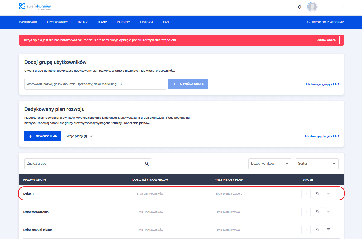 Aby utworzyć grupę należy przejść do zakładki “Plany”