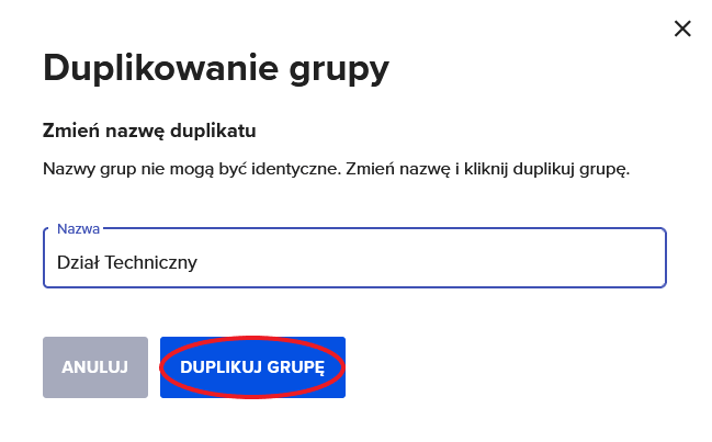 Po naciśnięciu przycisku otwieram nam się okienko z duplikowaniem grupy, w polu nazwa podajemy nazwę, musi być inna niż nazwy grup które już mamy, po wpisaniu nazwy przyciskamy duplikuj grupę.