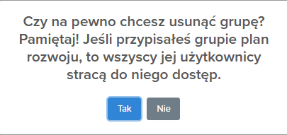 Ad. 3 - Trzecia i ostatnia opcja przycisku więcej to “ Usuń” po której naciśnięciu dostaniemy okienko z informacją “Czy na pewno chcesz usunąć grupę? Pamiętaj! Jeśli przypisałeś grupie plan rozwoju, to wszyscy jej użytkownicy stracą do niego dostęp.” i dwie opcje "Tak" i "Nie", po naciśnięciu "Tak" grupa zostanie usunięta, a po naciśnięciu “Nie” usuwanie zostanie anulowane